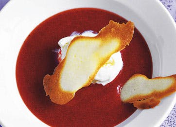 Skyl og nip jordbærrene, og stil dem til side. Kog sukker, hyldeblomstsaft og vand op sammen med vaniljekorn og bælg. Tilsæt jordbærrene, når sukkeret er smeltet; bring det i kog, og tag det fra varmen. Fjern vaniljebælgen, og blend jordbær og lage godt. Si suppen igennem en fintmasket si, og stil den på køl. Smag til med citronsaft lige før servering. Anret suppen i dybe tallerkener med en stor kugle vaniljeis og de sprøde kager til.