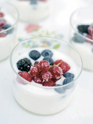 * Fordel koldskål cremen i 4 portionsskåle, og pynt rundhåndet med bær. Så har du en lækker portion koldskål.