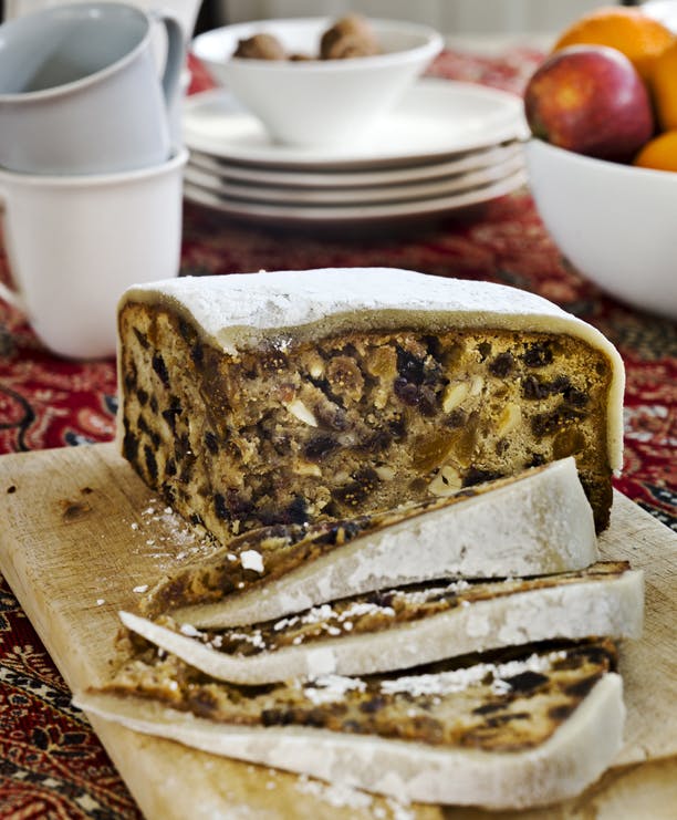 - Kagen kan spises, som den er, med et drys flormelis over. Men når det er jul, bør den pyntes: Tag kagen ud af formen, og læg den på et smukt fad. Smør abrikosmarmelade over kagen på toppen og ned ad siderne. Rul marcipanen ud til en cirkel som kan dække kagen helt, dvs. top og sider. Pak kagen ind i marcipanen og skær overflødig marcipan væk langs kanten. Drys med flormelis og pynt med cocktailbær, kristtjørn, bånd eller hvad julehumøret nu er til.