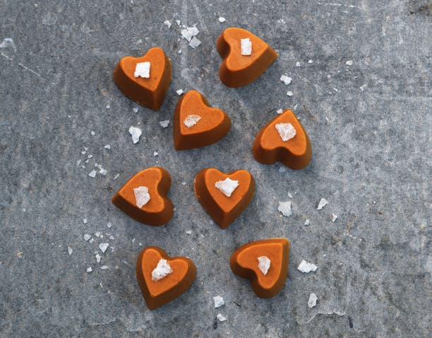 sæt formen på køl et par timer.Tag chokoladerne ud af formen, og pynt din konfekt med lidt havsalt.