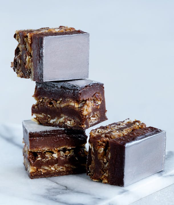 11. Når chokoladen har sat sig, skæres konfekten ud i mundrette firkanter med en skarp kniv. Pensl overfladen med spiseligt sølvmetal-pulver. Opbevar på køl.
