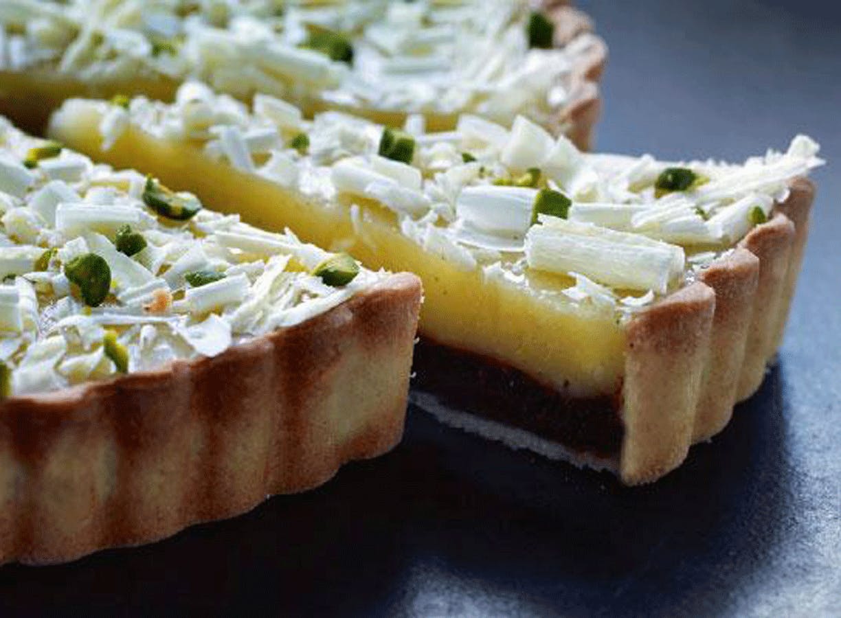 Lemon curd er en tyk, smørbar citroncreme, som især englænderne ynder at spise oven på nybagte scones. Lemon curd er et absolut must til et traditionelt engelsk teselskab, men den søde syrlige creme er også perfekt som fyld i kager eller som topping på cupcakes. Her bruger Mette Blomsterberg den i en dejlig tærte med chokolade i også.