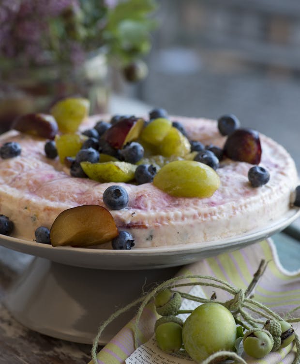 Du kan nemt forvandle sensommerens søde blommer til en smuk og smagsgod isdessert. Her er den lavet i form og pyntet med farvefine blommer og blåbær. Denne luksus isdessert vil med garanti blive et ganeforkælende hit hos hele familien eller serveret for gæster!