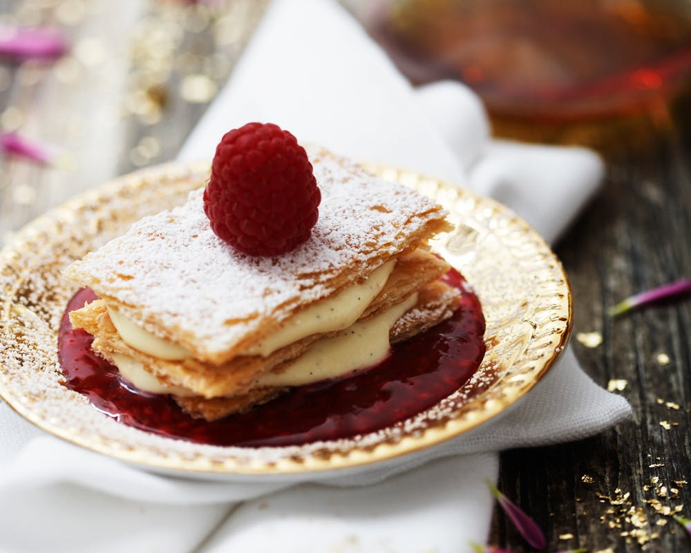 Mille-feuille eller Napoleonskage kaldes også tusind blade på andre sprog. Den er kendetegnet som en rektangulær stykke kage, der har mindst to lag butterdej og er fyldt med kagecreme, flødeskum, hindbærsyltetøj og med glasur på toppen. I denne opskrift er hindbærsyltetøjet skiftet ud med hindbærcoulis - og i stedet for flydende glasur, er der drysset løst florsukker på toppen.