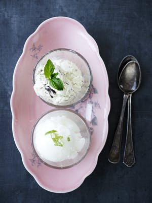 Mynteis: Pisk fløden stiv. Pisk æggeblommer og sukker til en luftig masse, og tilsæt Sirop de Menthe og pebermynteolie. Vend forsigtigt flødeskummet i æggemassen sammen med hakket chokolade. Hæld cremen i en form, og stil den tildækket i fryseren i 4-5 timer. Vend isen 3-4 gange den første time.