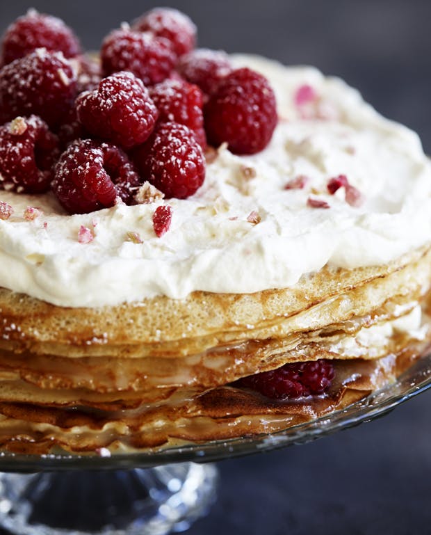 2. Fyld: Pisk fløden til skum. Læg en pandekage på et serveringsfad, og smør et tyndt lag lemoncurd på. Læg en ny pandekage på, og smør med et tyndt lag flødeskum. Fortsæt med at bygge lagkagen op med skiftevis lemoncurd og flødeskum, og læg et lag med halvdelen af hindbærrene i midten af kagen.