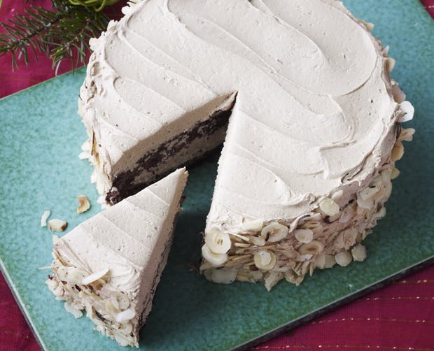 Pynt siderne af din nougatlagkage med hasselnøddeflagerne, og stil kagen koldt. Server din nougatlagkage samme dag eller dagen derpå.
