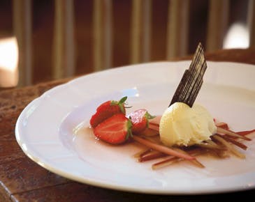 TIPS: På Drakamöllan serveres desserten med friske jordbær og en lille tynd flage af mørk chokolade. Den tilberedes nemt ved at smelte chokoladen og brede den ud til afkøling på et stykke køkkenfilm eller en silikonemåtte, som siden trækkes af chokoladen.