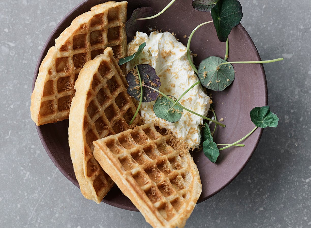 Kastanjevaffel med friskost, bottarga og tallerkensmækker
