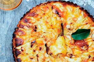 Desserttærten her er bagt helt sprød, fyldt med friske pærer og toppet med smeltet abrikosmarmelade. Server evt. pære-mandeltærten sammen med fromage frais.