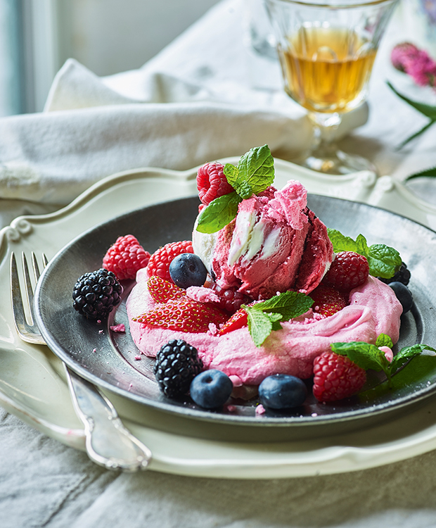 TIP: Du kan sagtens lave pavlovaen med andre former for flødeis end lige skovbær, og du kan fint variere bærerne efter, hvilke der er i sæson netop nu.