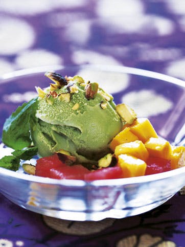 Pakistanske desserter er per tradition meget søde (oftest små søde friturestegte kager i sukkerlage). En lettere og mere tilgængelig dessert, der vil passe godt som afslutning på en pakistansk buffet, er is serveret med ristede nødder og en frisk frugtsalat af mango og melon skåret i terninger. Se også desserttips ved opskriften på mango-lassi.