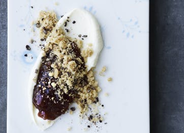 Anret cremen på 4 tallerkener, kom kompotten på og smuldr den sprøde makron på toppen. Pynt evt. med kakaobønner eller hakket chokolade.