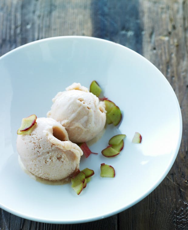 Is-tiden er over os, og vi kan lave lækker is og sorbet af de fleste af havens søde grøder. Ikke mindst rabarberen, der næstefter jordbær nok er det, der minder os mest om sol og sommer. Den cremede sorbet serveres med råsyltet rabarber. Når rabarber drysses med sukker, og de får lov til at stå og trække, bliver rabarberstykkerne lidt blødere, og sukkeret trækker lidt saft ud. På den måde beholder de deres friskhed og lidt sprødhed, som går fint til sorbeten.