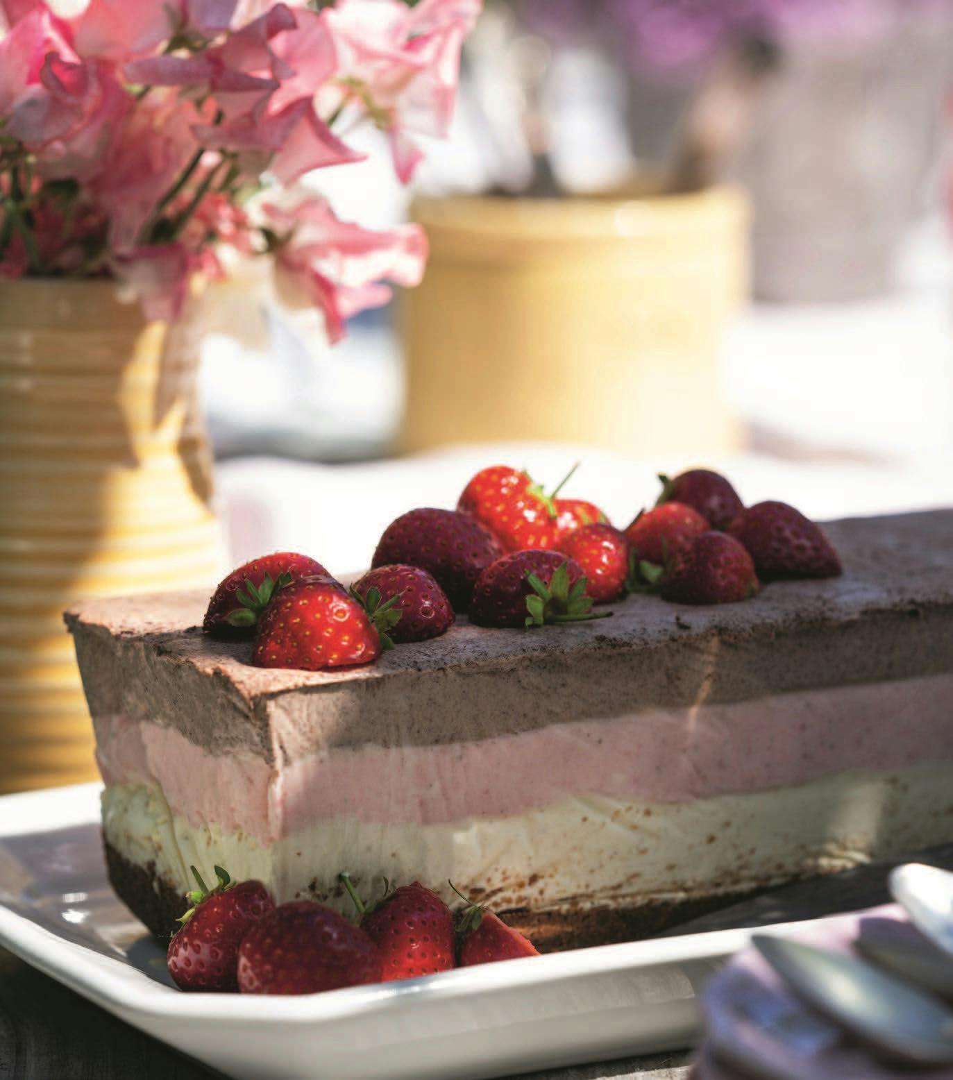 Fordel chokoladeisen på jordbærisen, og sæt formen tilbage i fryseren i mindst 4 timer.