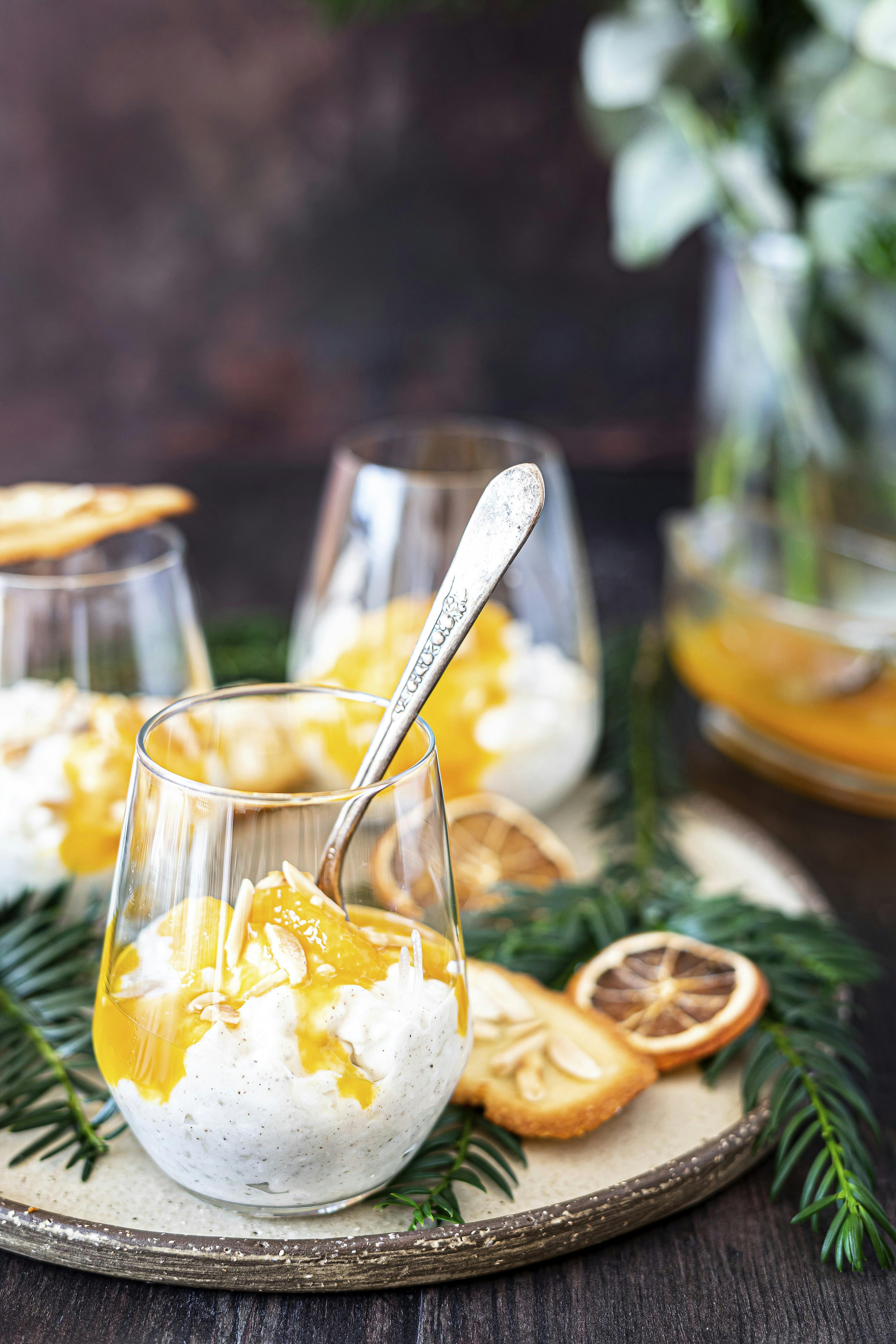 Bag kagerne gyldne i ovnen i 8-10 minutter. Anret risalamanden i glas, hæld klementinsauce over, og top med mandeltuiles.