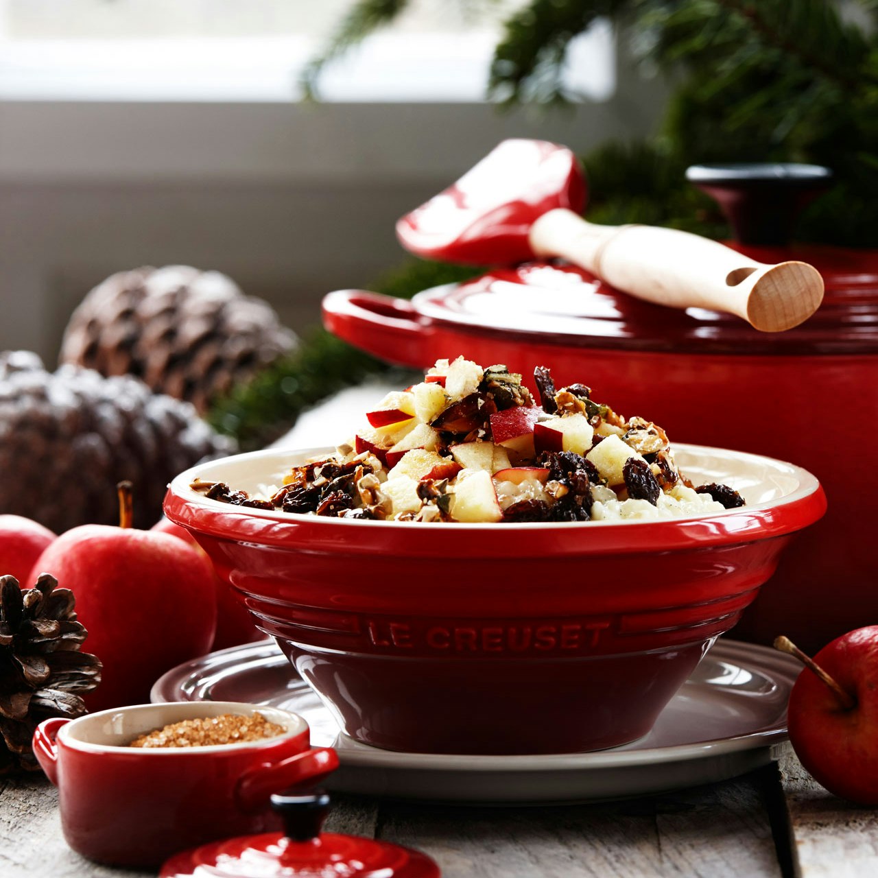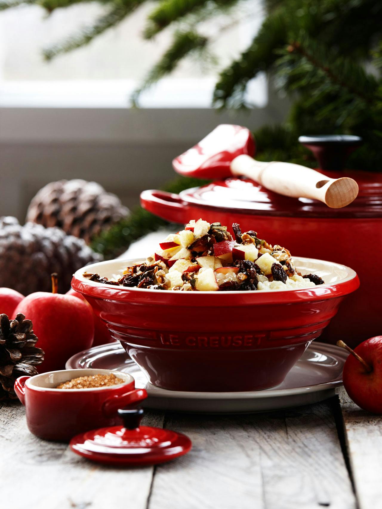 Risengrød er en favoritspise i julen, og selvom det er en gammel klassiker, kan du sagtens variere din topping og prøve en helt ny udgave. Her får du opskriften på Risengrød med topping af æbletern, rosiner og honningristede kerner. Prøv den også som en lækker smagsvariant ved morgenbordet.