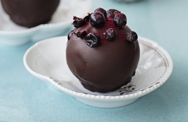Temperér chokoladen og overtræk romkuglerne ved at rulle dem rundt i den smeltede chokolade. Sæt dem af på et stykke bagepapir. Giv dem straks et drys knust, frysetørret solbær, inden chokoladen størkner.