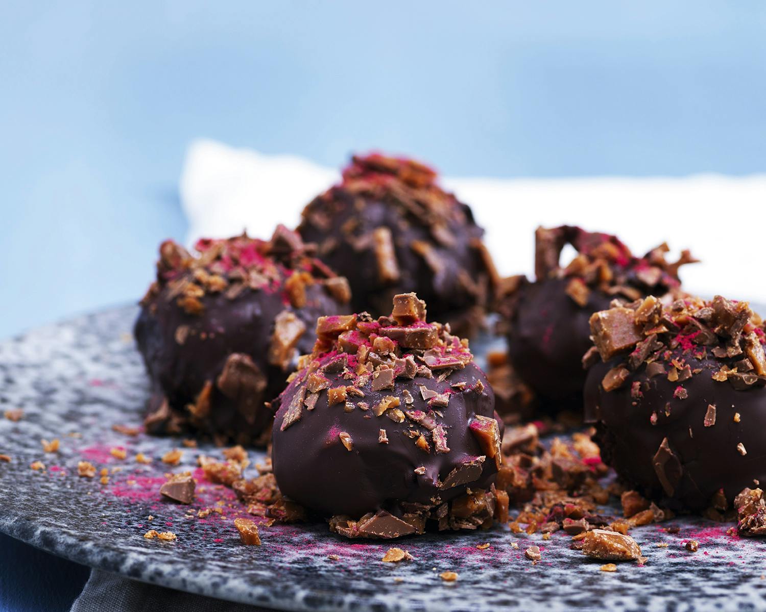 6. Pynt: Smelt chokoladen i en varmefast skål over vandbad. Hak Daim fint, og læg det på en tallerken. Dyp romkuglerne i den smeltede chokolade, og tril dem derefter i Daim. Drys evt. med hindbærpulver. Lad romkuglerne størkne på et ark bagepapir.