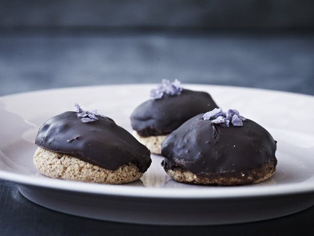 Overtræk: Smelt nu chokoladen til overtræk over vandbad, hold makronen, og dyp kagen i chokoladen. Lad dem dryppe godt af, inden de sættes på bagepapir. Pynt evt. med kandiserede violer på toppen. Opbevar kagerne koldt indtil de skal spises.