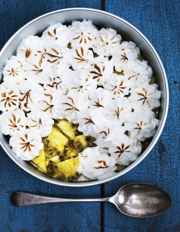 Pavlova er en skøn kage, som du kan tilpasse dig og dine smagsløg. Normalt er den sprøde marengs i bunden, mens toppen består af frisk frugt eller bær, men i dette tilfælde har vi gjort det lidt anderledes. Vi har nemlig vendt den klassiske pavlova på hovedet og lagt den skønne frugt i bunden og marengs på toppen. Det vil helt sikkert få dine gourmet-gæster til at spærre øjnene op. Se også: Pavlova med jordbær