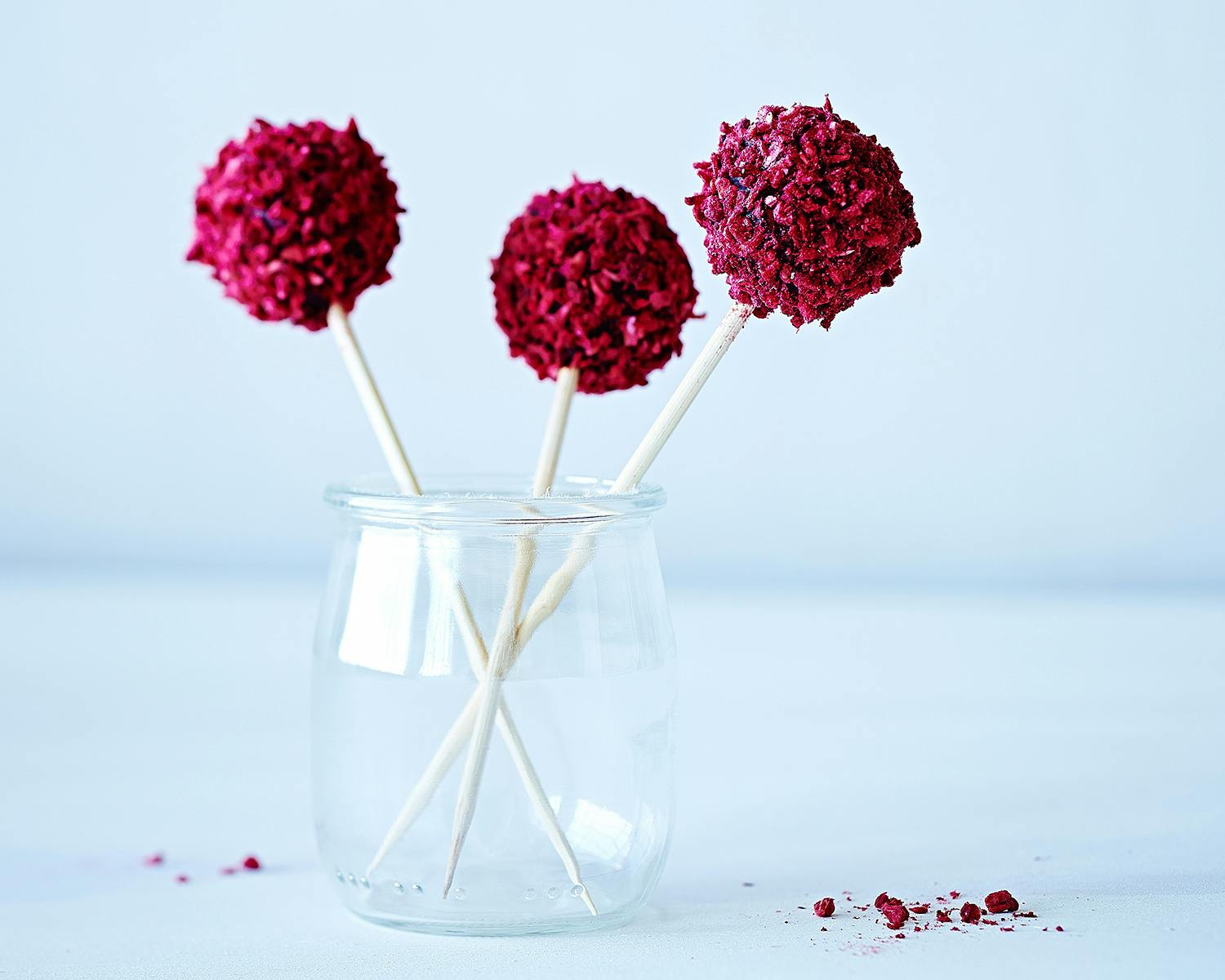 4. Pynt: Smelt forsigtigt chokoladen i en skål over vandbad, og hæld den over i et lille glas. Dyp 1 slikkepind ad gangen ned i glasset med chokolade, og rul den derefter i frysetørrede hindbær. Gentag med resten af slikkepindene. Opbevar dem i køleskabet.
