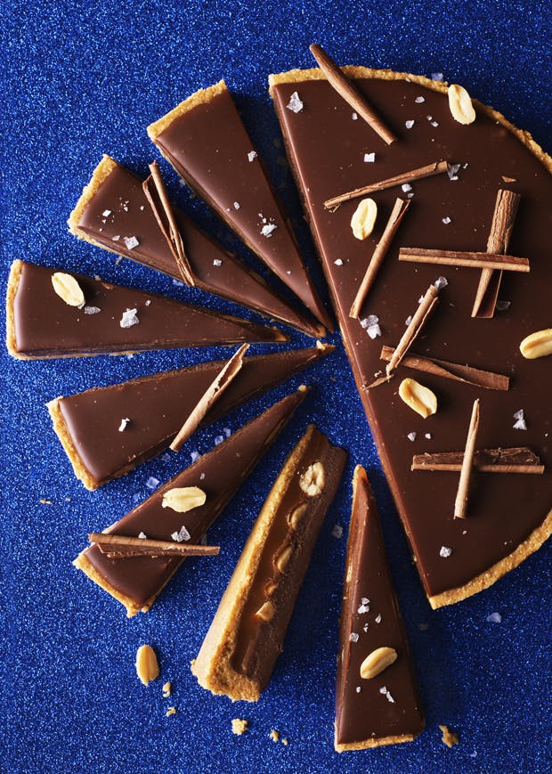 2. Karamel: Varm forsigtigt karameller og fløde i en tykbundet gryde, indtil karamellerne er smeltet, og massen er ensartet. Tilsæt salt. Fordel karamelmassen oven på kiksebunden, og drys peanuts ud over. Sæt tærten tilbage på køl.