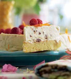 Lad isen fryse ind, det tager omkring 4-6 timer. Tag parfaiten ud af fryseren, og sæt den i køleskabet ca. 20 minutter før servering. Pynt iskagen med friske hindbær og morgenfrueblade.
