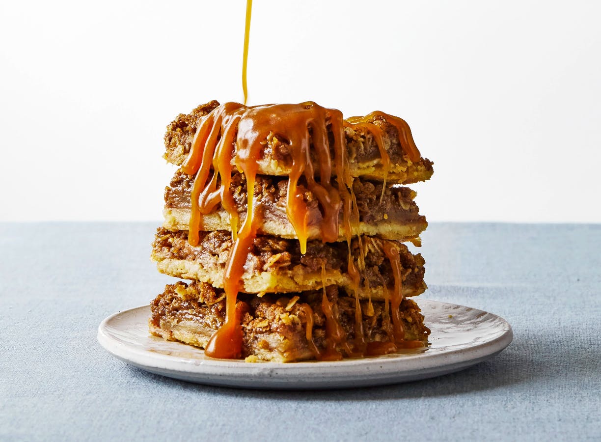 Vi kan i hvert fald garantere, at den almindelige hindbærsnitte blegner en smule ved siden af disse søde, snaskede og sprøde snitter. De har nemlig både et lag af blød kagebund, smurt med sødt æblefyld, toppet med sprød crumble og sidst, men ikke mindst, overhældt med flydende karamel.