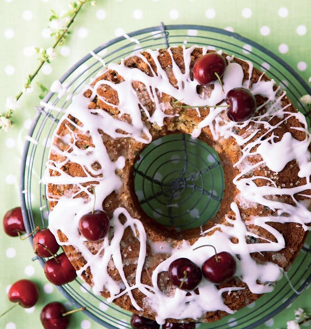 5. Citronglasur: Rør flormelis, citronsaft og vand sammen til en jævn glasur, og fordel den over kagen i et lidt tilfældigt mønster.