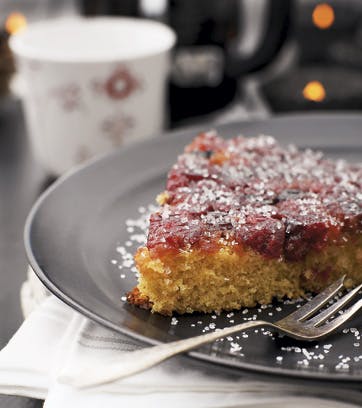 Læg et fad omvendt over den færdigbagte tranebær-kage og vend det hele rundt, så kagen bliver upside down. Løft forsigtig tærtebunden af ved hjælp af en paletkniv.