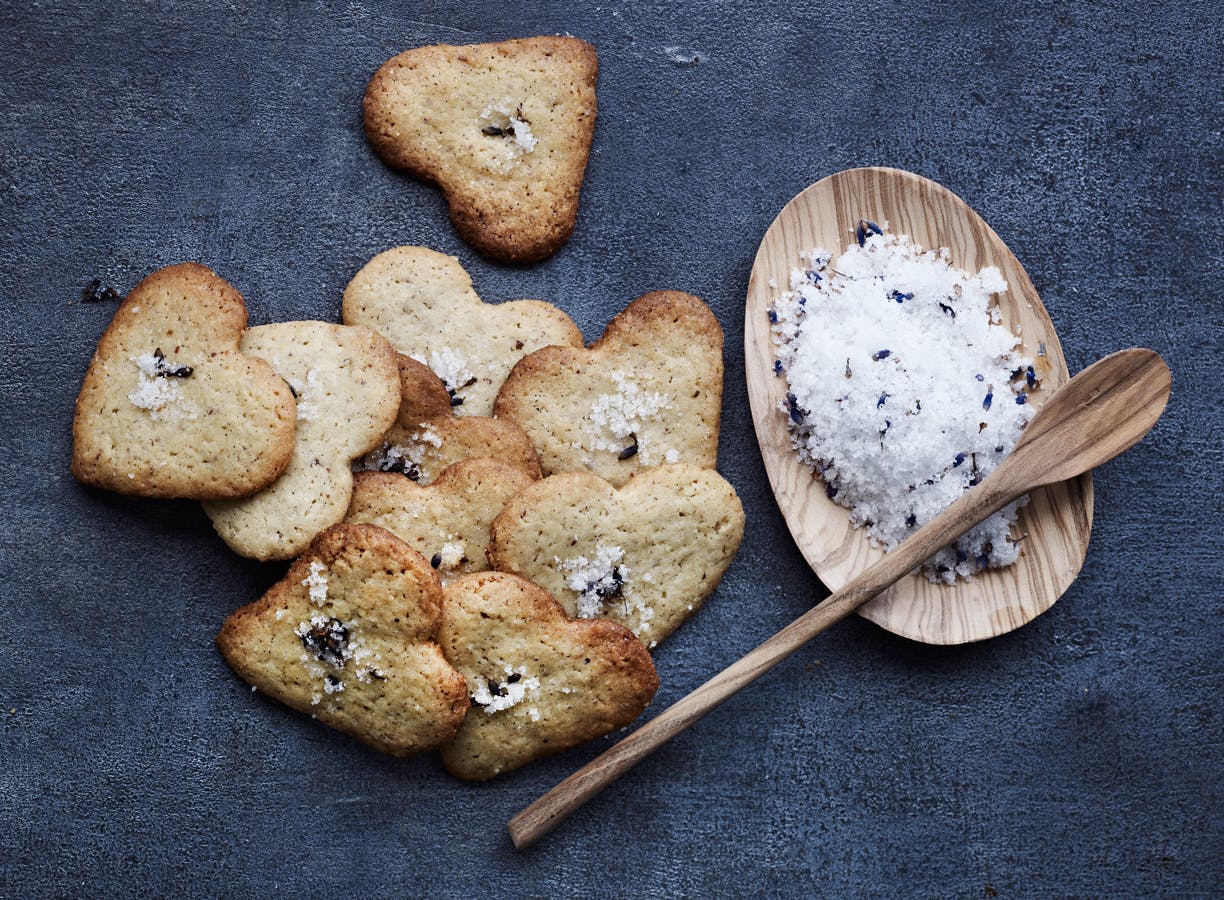 Strø lidt hvedemel ud på bordet, og rul dejen ud. Udstik dejen i små hjerter med en lille hjerteform. Læg kagerne på bageplader med bagepapir. Blend nu sukker og tørrede lavendler, og strø kagerne med lidt lavendelsukker.