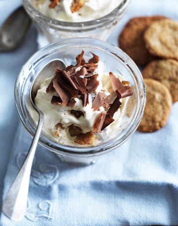 Lad vaniljeisen tø lidt op. Knus nogle af kagerne let, og vend dem i isen. Kom isen i små portionsglas, og drys høvlet chokolade hen over.