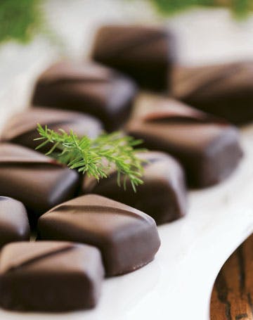 Skær trøflerne ud i passende stykker med en kniv og overtræk dem evt. med mørk chokolade som vist på billedet. Lys chokolade kan også bruges, og trøflerne kan også drysses med kakao. Det fine mønster på chokoladens overflade kan skabes med spidsen af en kniv eller en lille gaffel.
