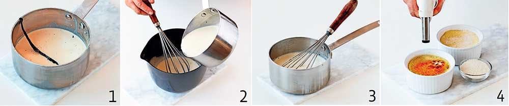 4. Karamellåg: Tag de kolde cremer ud af køleskabet. Drys ca. 1 spsk. rørsukker over hver af dem i et jævnt lag. Karamellisér sukkeret med en lille gasbrænder. Stop, når sukkeret begynder at boble og smelte sammen. Alternativt kan du tænde ovnen på grill og sætte de 4 sukkerdryssede cremer i ovnen under skarpt opsyn. De skal ud, lige så snart sukkeret er smeltet, for ellers varmes cremen op igen og bliver for blød. Lad de karamelliserede cremer køle helt af igen, og servér dem inden for 1 time. Hvis de står for længe, kan karamellen blive blød.