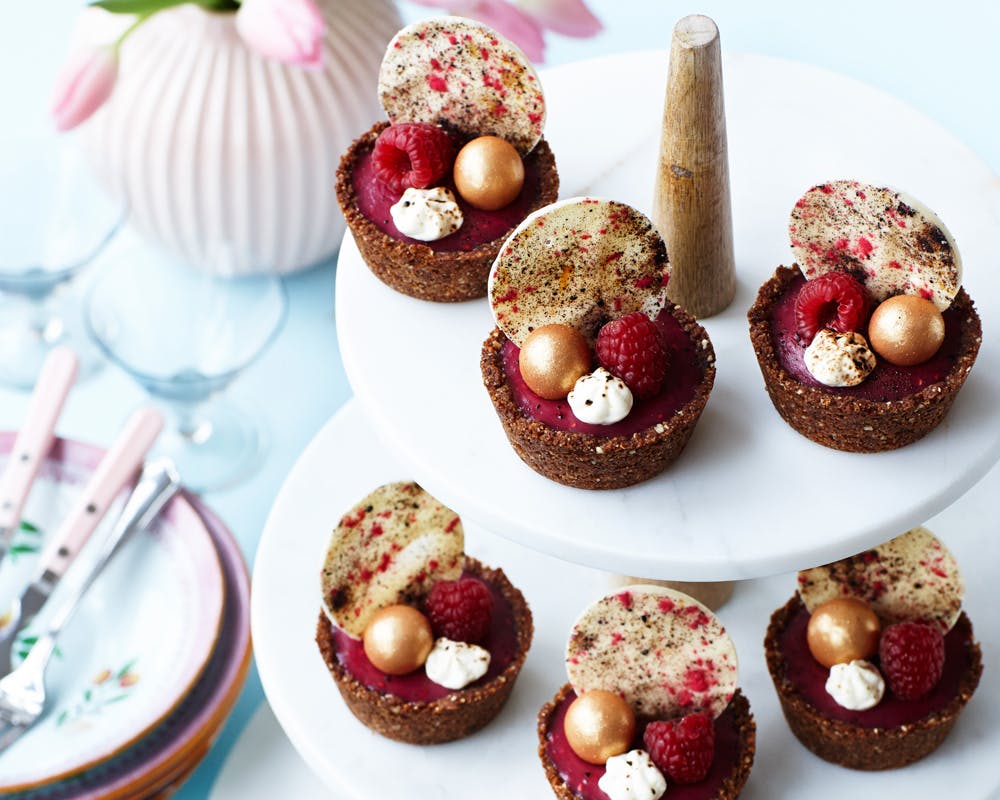 4. Løft forsigtigt de 10 afkølede kiksebunde ud af muffinformen, og sæt dem på et fad. Fordel hindbærchokoladen i kiksebundene, og sæt kagerne på køl i mindst 4 timer.