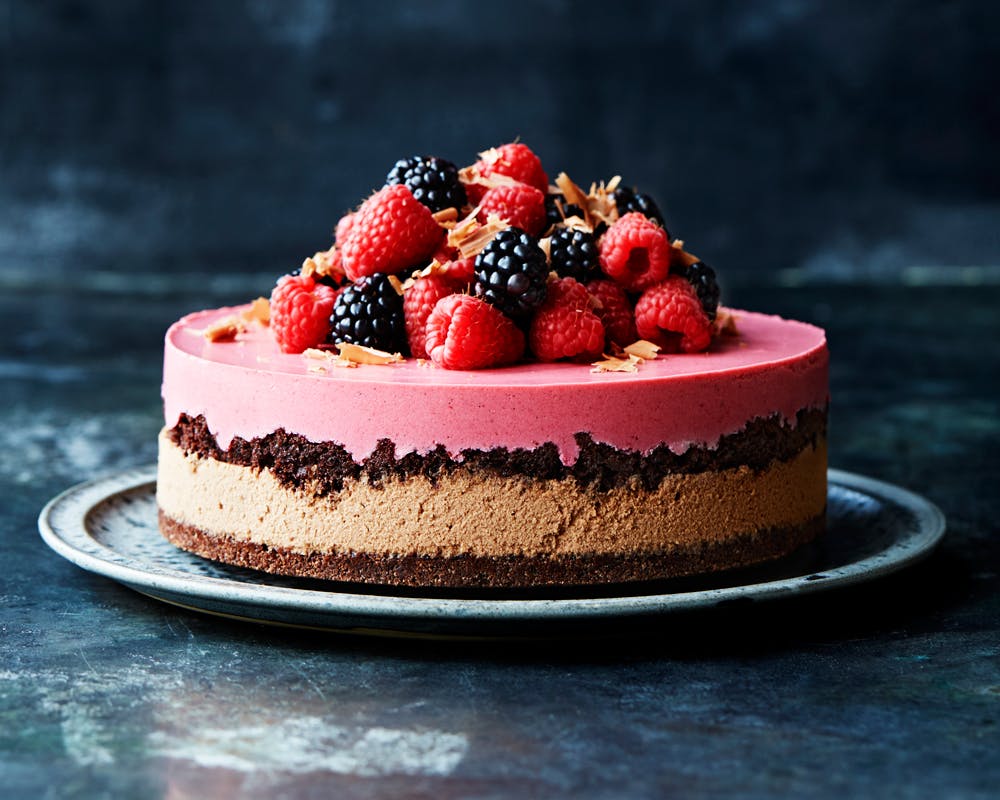 Denne lagkage imponerer med sin sprøde kiksebund, to slags fløjlsbløde mousser og et væld af friske bær på toppen. Få opskriften her.