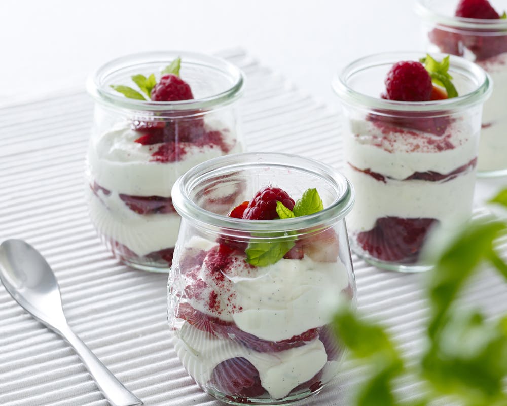 Læg lidt jordbær og hindbær i små portionsglas, kom creme ovenpå, derefter bær og creme igen. Pynt med friske bær, lidt krydderurt og et drys knuste frysetørrede hindbær.