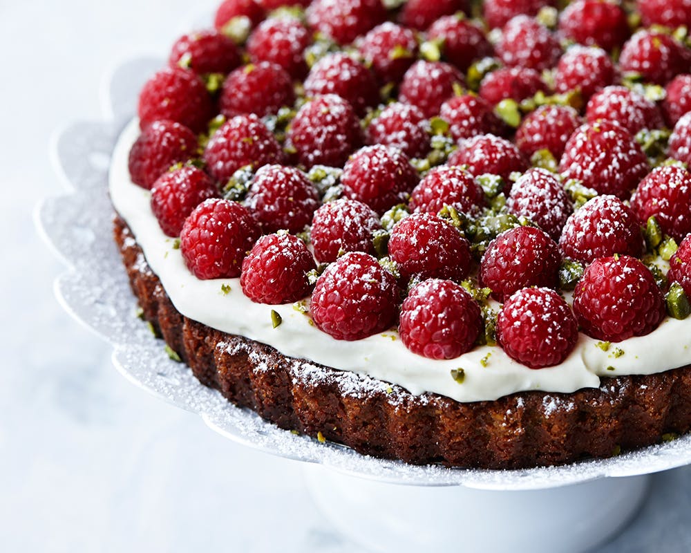 4. Læg hindbærrene på kagen i et flot mønster, og pynt med finthakkede pistacienøddekerner.