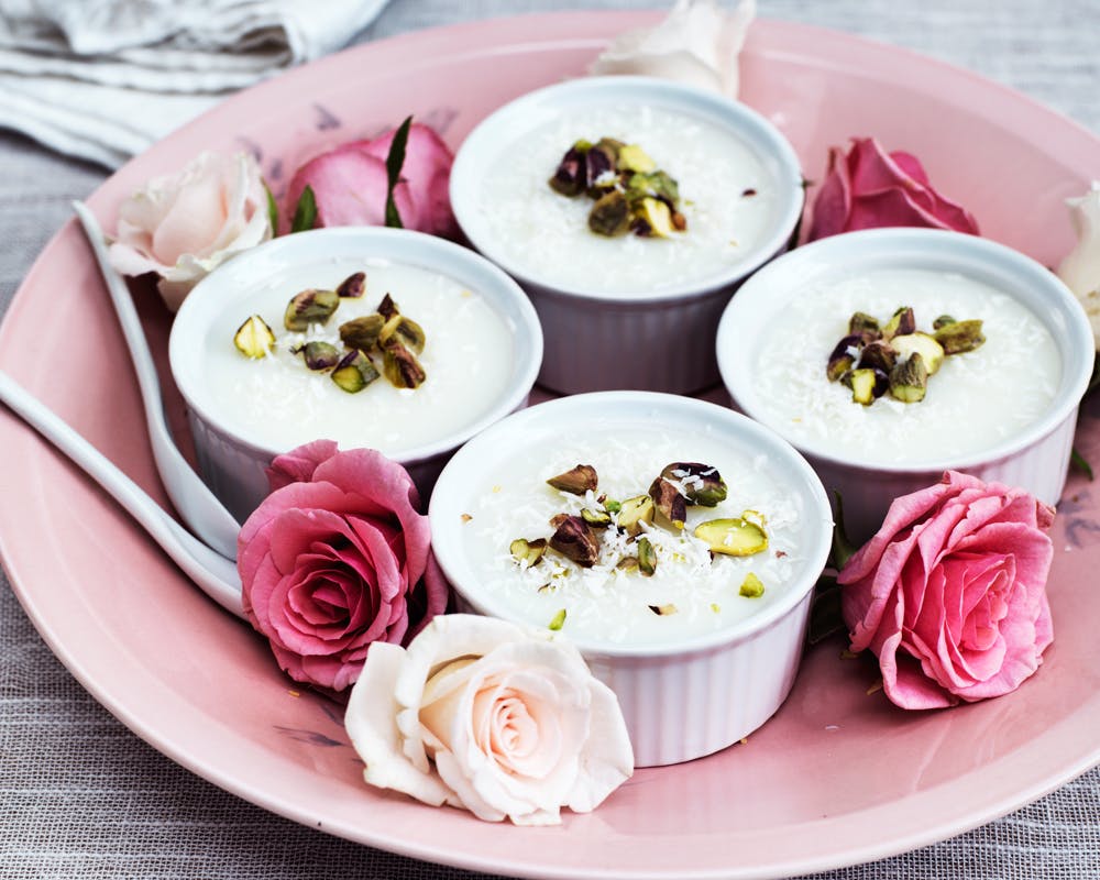 Drys desserterne med kokosmel og hakkede pistacienødder, og dryp med sirup.