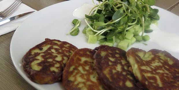 Kog blomkålshovedet akkurat mørt i spilkogende letsaltet vand. Tag det op, og lad det dryppe af. Hak blomkålen groft, og kør den med de øvrige ingredienserne i en foodprocesser til en blød dej. Varm rigeligt med olie op i en stor stegepande. Brug en spiseske til at forme blomkålsdejen til runde bøffer. Steg dem på den ene side ved høj varme, indtil de har taget farve. Vend dem forsigtigt, og brun dem et øjeblik på den anden side. Tag dem af panden og læg dem på en tallerken beklædt med køkkenrulle, så overskydende fedt kan blive absorberet. Server bøfferne varme med græsk yoghurt og en salat til.
