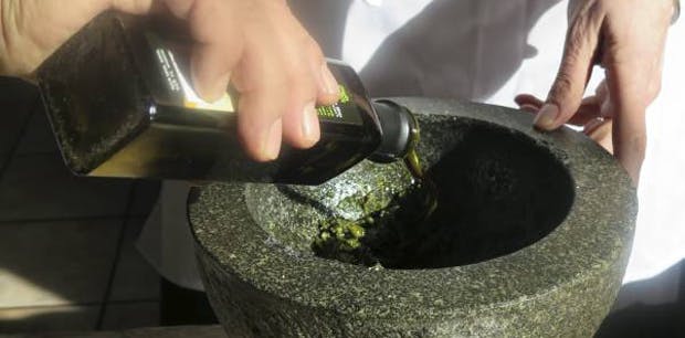Skyl za’atar, og pil bladene af stilken. Put først to fed hvidløg i en foodprocessor eller en morter. Tilsæt bladene, valnødder og salt. Hæld olie i, indtil konsistensen hænger sammen, og smag til med citronsaft. Pestoen egner sig både til suppe, i sandwich og pasta eller som dip.
