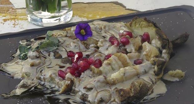 Læg auberginerne på en tallerken, og skær grove ridser i auberginekødet, så der kan trænge smag ind. Drys en smule salt og friskpresset citronsaft på. Spred tahin ud over auberginekøddet som dressing. Gentag med granatæblesiruppen. Hak persillen, og drys den udover sammen med friske granatæblekerner.