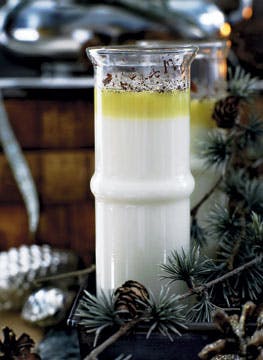 Opvarm mælken i en gryde, den må ikke koge. Smelt den hvide chokolade i mælken sammen med cognac. Anret lumumbaen i høje glas med revet mørk chokolade. Overfladen vil få en flot gullig farve.