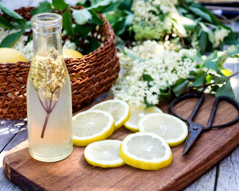 Her får du opskriften på en helt klassisk hyldeblomstsaft – men du kan også eksperimentere med ingredienser som limeskal, rosenvand og brun farin og skabe din helt eget variant af den klassiske drik.