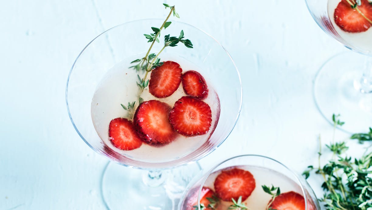 Fyld 4 glas med isterninger og jordbærskiver, hæld drinken over, og pynt med timiankviste. Servér straks.