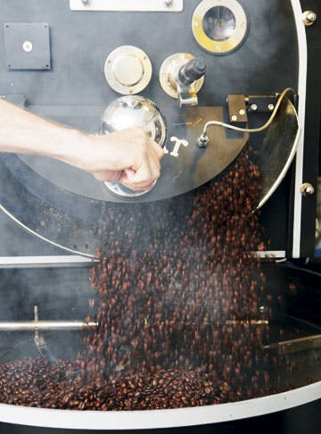 Det sker på sekunder - ved 192° går karamelliseringsprocessen i kaffebønnerne i gang. Og Samuel, der står ved den store kafferistermaskine og passer på, at de 42 kilo bønner ristes på den rigtige måde, hiver begejstret ud i den lille, buede bønne-ske i maskinen, så jeg kan dufte, hvad denne proces betyder for bønnernes duft. Ingen tvivl: Den lidt høagtige duft er nu afløst af en tæt, skøn popcornlignende.