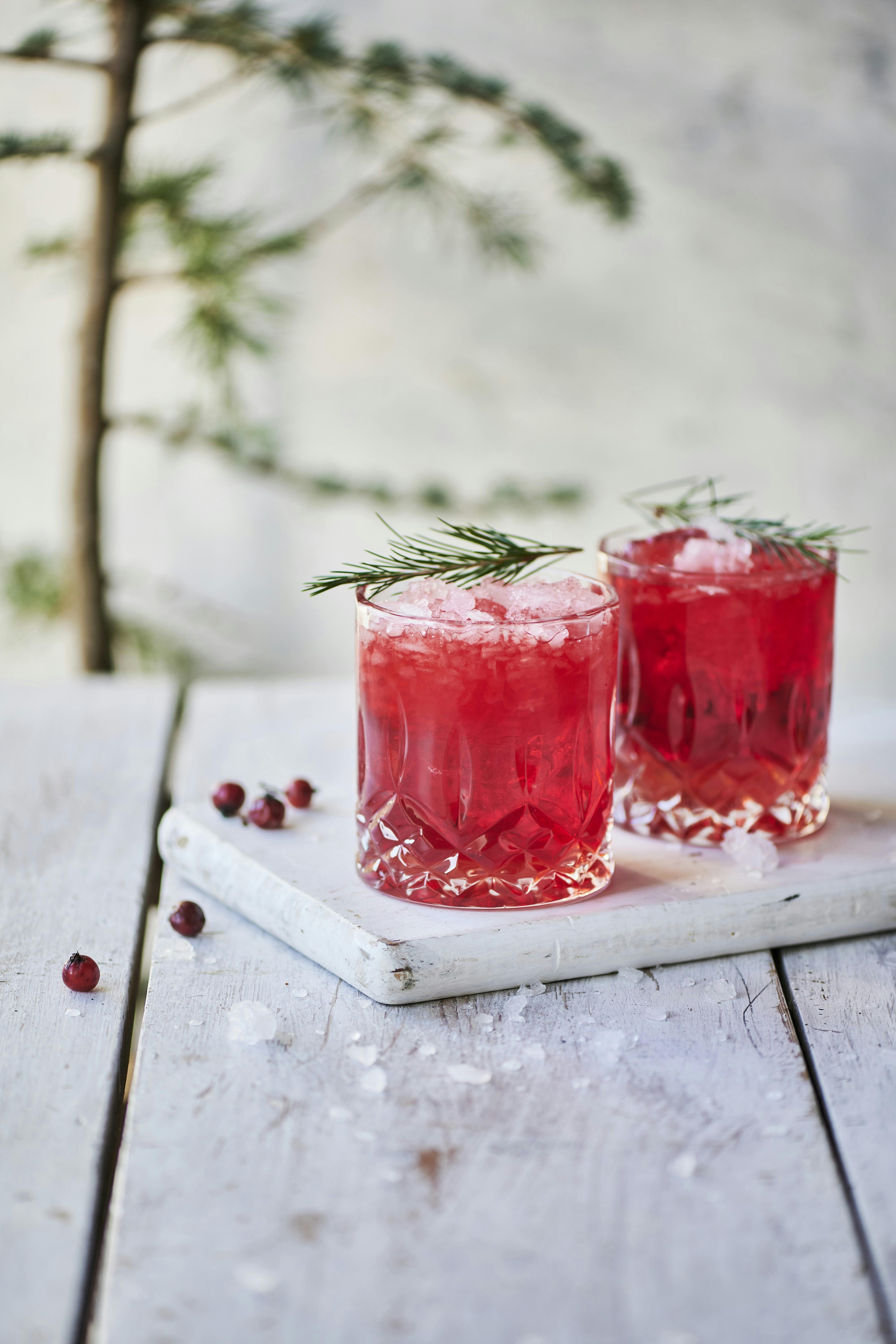 3. Rør i blandingen, og hæld den i to glas. Tilsæt is og servér evt. med en appelsinskive og kandiseret rosmarin. Gem resten af siruppen i køleskabet.