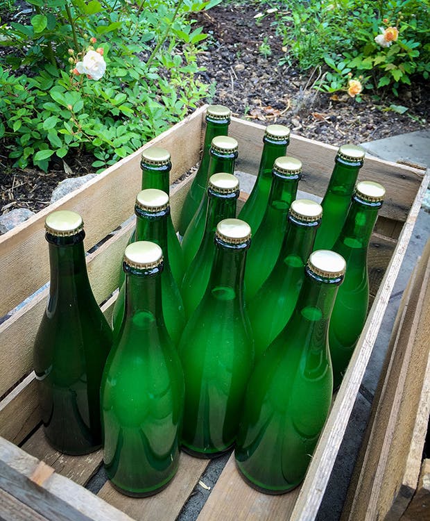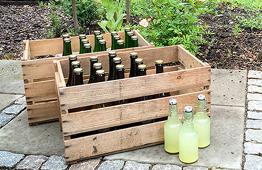 ÆGTE CHAMPAGNEFLASKER: Du bør bruge ægte champagneflasker til efterkarboneringen, da trykket kan blive ekstremt højt. En ægte champagneflaske vejer næsten ét kilo, hvorimod øvrige flasker vejer langt mindre. Og lette flasker kan eksplodere – så er du advaret. Og så er det bare at vente en uges tid, og din hyldeblomstchampagne er færdig. Lader du din champagne stå, vil den udvikle sig i smag og karbonering. Og det smager himmelsk …