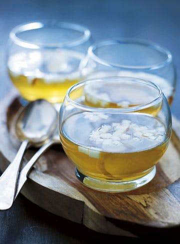 Hæld alle ingredienser bortset fra æblet i en gryde og kog blandingen op. Tag gryden af varmen og lad toddyen trække ½-1 time, inden den sigtes. Varm let op igen og smag evt. til med lidt ekstra citron og ingefær. Tilsæt frisk æble skåret i små terninger lige inden servering.
